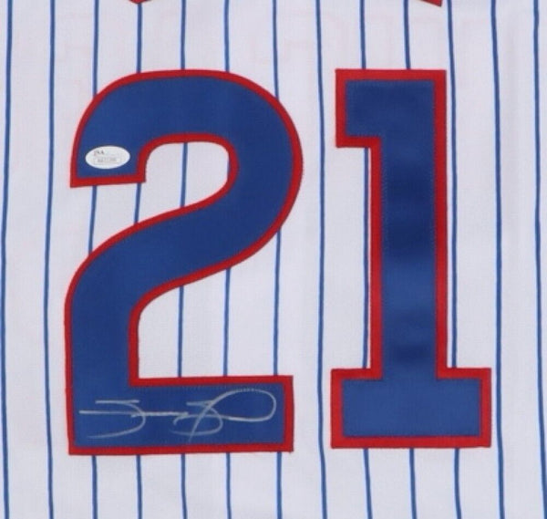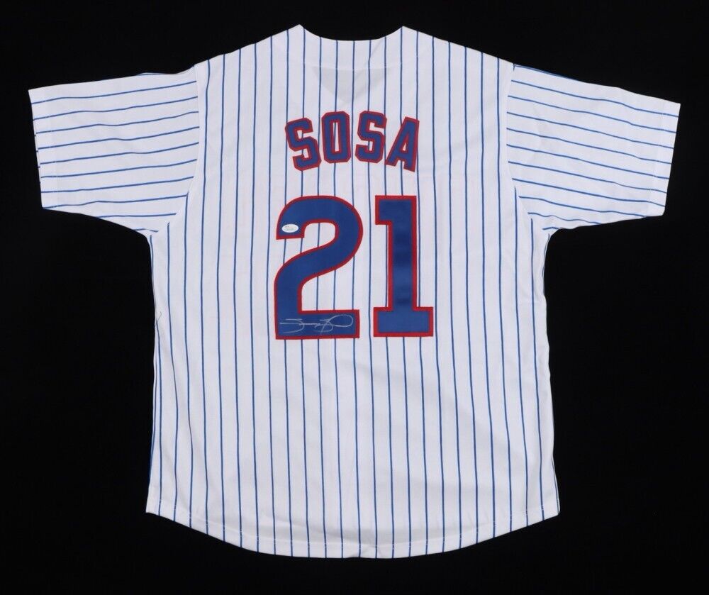 Custom on-field style jersey. Everything is sewn on, size XL. Hand-signed by Sammy Sosa. Samuel Kelvin Peralta Sosa (born November 12, 1968) is a Dominican American former professional baseball right fielder. Starting his career with the Texas Rangers, Sosa became a member of the Chicago Cubs in 1992 and became one of the game's best hitters.The lot / autograph(s) includes an official James Spence Authentication (JSA) hologram and matching COA for authenticity purposes.Authentication: JSA COA