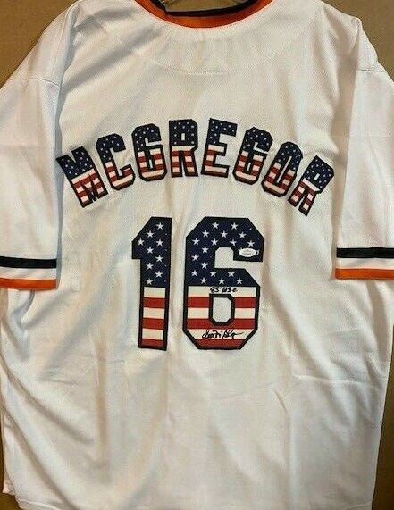 Custom on-field style jersey. Everything is sewn on, size XL. Hand-signed and inscribed by Scott McGregor.The lot / autograph(s) includes an official James Spence Authentication (JSA) hologram and matching COA for authenticity purposes. The signing of this item was witnessed by JSA.Authentication: JSA COA