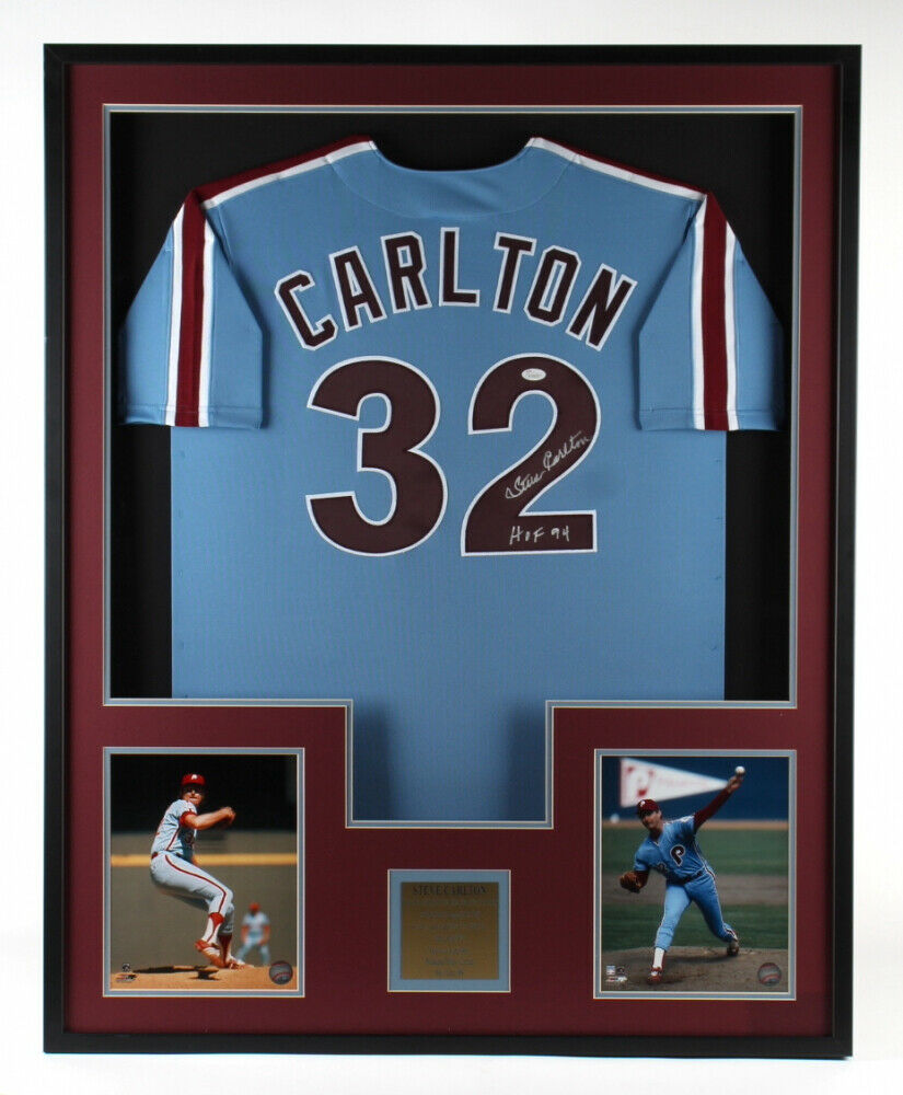 Custom frame measures approximately 33" x 41" in size and features a custom on-field style jersey that has been hand-signed by Steve (Lefty) Carlton.The lot / autograph(s) includes an official James Spence Authentication (JSA) hologram for authenticity purposes. The signing of this item was witnessed by JSA.Authentication: JSA Hologram