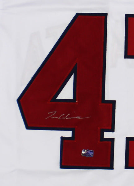 An Atlanta Custom White Jersey hand signed by Tom Glavine. The item and signature are in excellent condition. Tom is a former baseball pitcher for the Atlanta Braves. He is a 10x All-Star, World Series Champion, 2x NL Cy Young Award Winner, World Series MVP, 4x Silver Slugger Award Winner & a 5x NL wins leader. AUTHENTICATION: The item is accompanied by a JSA Certificate of Authenticity - JSA Serial Numbered Hologram -