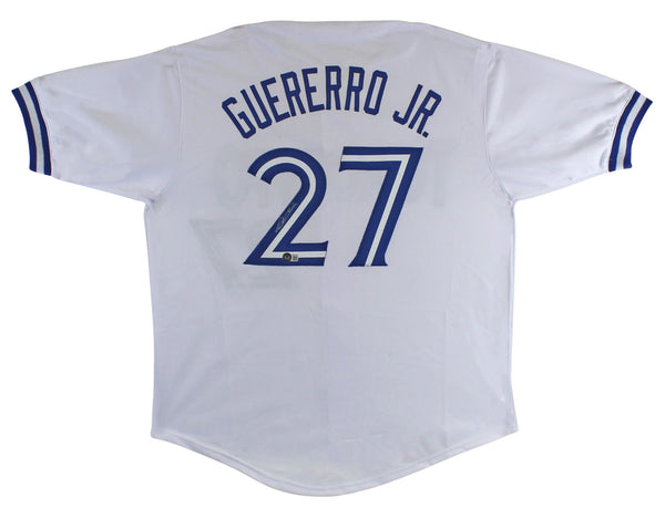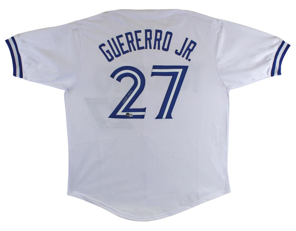This Autographed White Pro Style Jersey has been Personally Signed by Vladimir Guerrero Jr. of the Toronto Blue Jays. This item is 100% Authentic to include a hologram by Beckett Authentication Services. This item will come with the new Beckett Authentication hologram that has a scannable QR code rather than the traditional COA. If you would like to have a COA, you are welcome to reach out to Beckett for a printed certification once you receive your item. This is a BAS Witnessed Protection Program item which means a Beckett Authentication Service representative was present when this item was being signed. This is a stock item. We conducted an autograph signing with Vladimir Guerrero Jr. and we have several of these available. The one you will receive will be of equal quality to the one pictured. This item can be verified through BAS Witnessed. This is a X-Large sized, non-branded, custom-stitched Jersey.