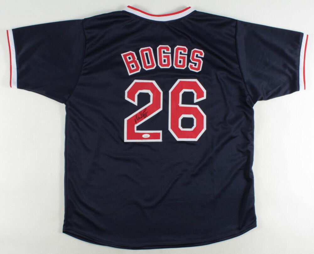 Custom on-field style jersey. Everything sewn on, size XL. Hand-signed in silver paint pen by Wade Boggs (Boston Red Sox, New York Yankees, Tampa Bay Devil Rays, HOF). The lot / autograph(s) includes an official James Spence Authentication (JSA) hologram and matching COA for authenticity purposes. The signing of this item was witnessed by JSA.Authentication: JSA COA Shop our ebay store / Friendly Confines Collectibles for thousands of different autographed jerseys