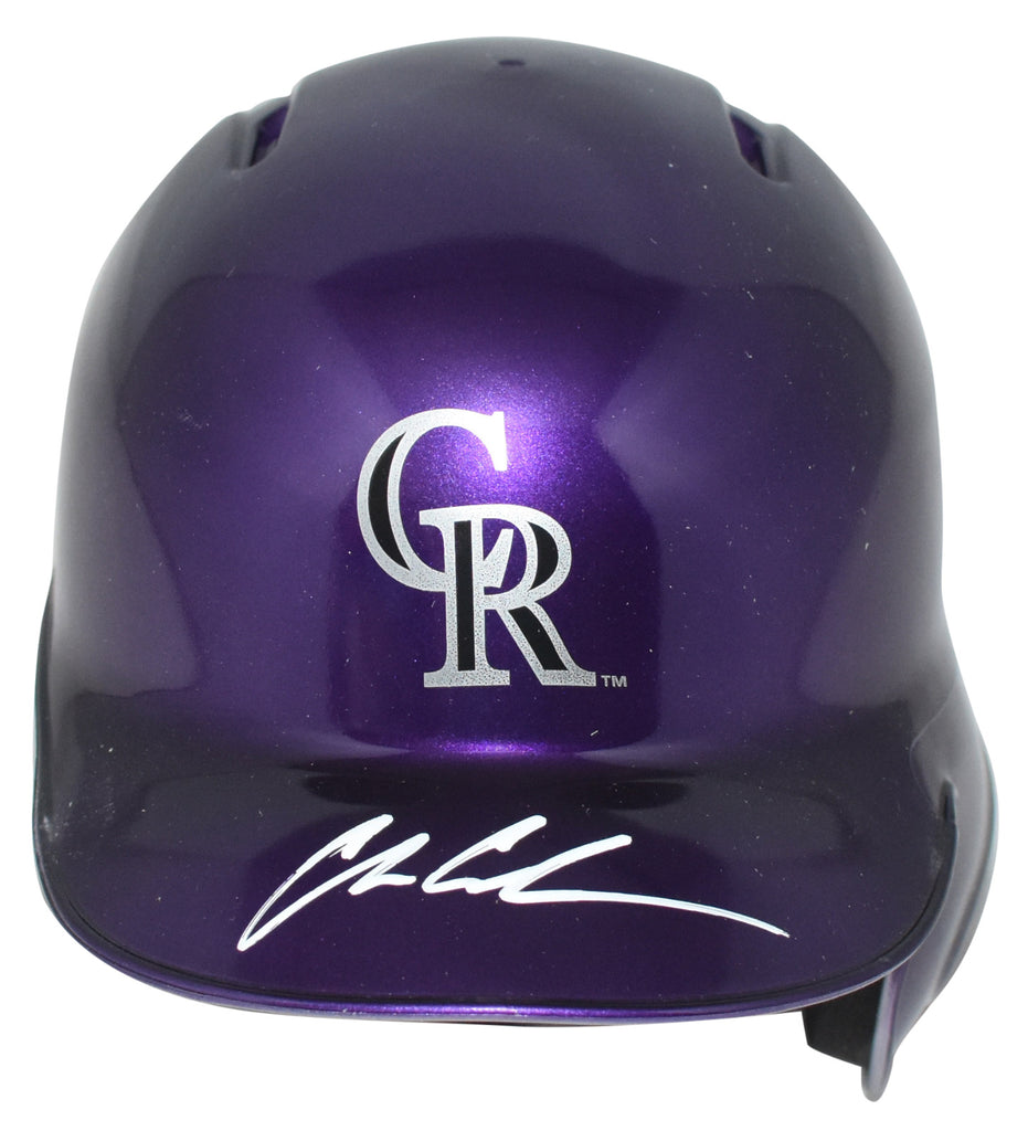 Charlie Condon, the 3rd overall pick for the Colorado Rockies, has hand signed this chrome Rockies Rawlings mini helmet at a private signing. This item is authenticated by Beckett Authentication Services and was signed in the presence of one of their representatives. Their tamper-evident hologram featuring a QR code and serial number is on the item. The authenticity can be verified online by entering the serial number or scanning the QR code.Item pictured may not be the exact item you will receive. It will be similar quality, and we guarantee your satisfaction.