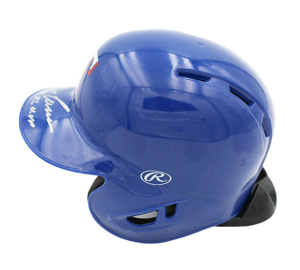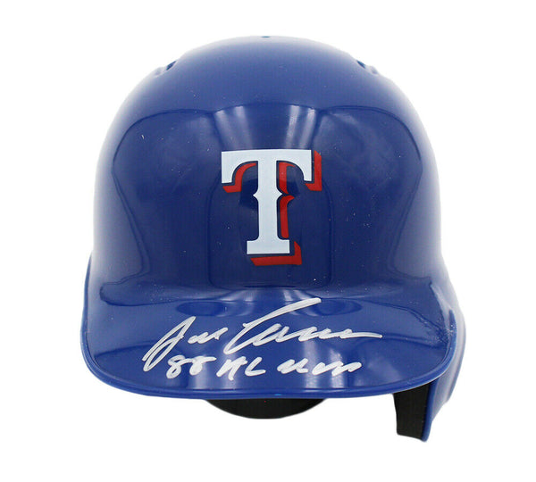 An Texas Rangers Rawlings Current MLB Mini Helmet hand signed by Jose Canseco. The item and signature are in excellent condition. In addition to signing his name, Jose also inscribed "88 AL MVP" on the item. Jose is a former MLB outfielder. He is a Rookie of the year, 2x World Series Champion, 6x All-Star & a 4x Silver Slugger Award winner. AUTHENTICATION: The item is accompanied by a Certificate of Authenticity - Serial Numbered and Databased Hologram - Picture of Jose from the signing