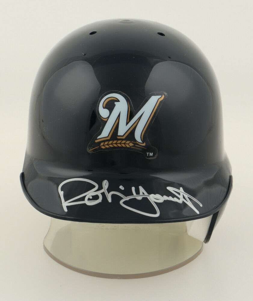 Riddell Milwaukee Brewers Batting mini helmet. Hand-signed by Robin Yount (HOF). The lot / autograph(s) includes an official Beckett Authentication Services serially numbered hologram for authenticity purposes. The signing of this item was witnessed by Beckett.Authentication: Beckett Hologram