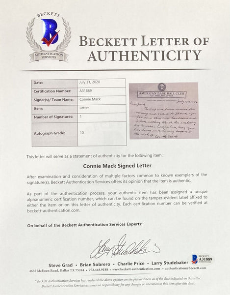 Featured is a Connie Mack signed, hand written letter. This letter has been hand written by Connie Mack and comes with the Beckett hologram and letter of authenticity, receiving an autograph grade of 10. This letter would make a great addition to any sports memorabilia collection!. SPECIFICATIONS Autographed By: Connie Mack Team: Philadelphia Athletics Sport: Baseball Authentication: Beckett Grading Services