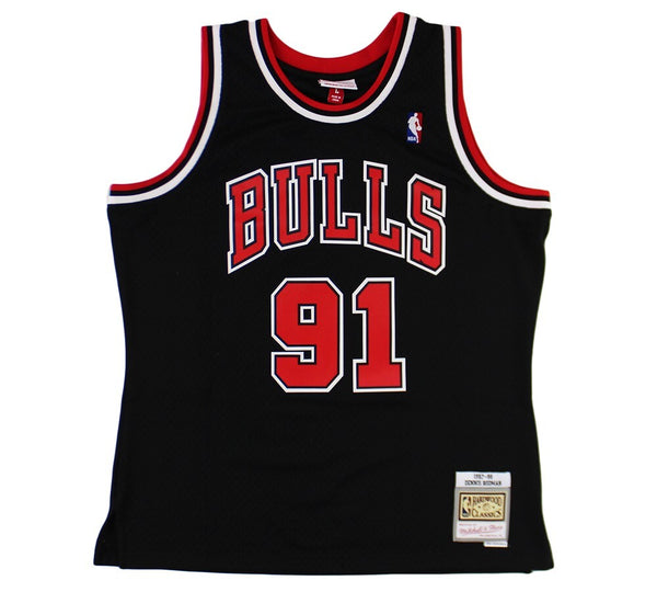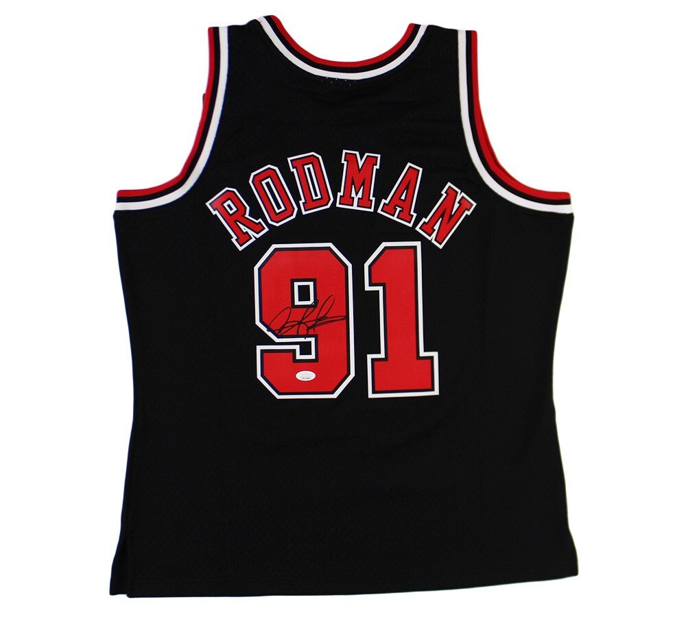 A Chicago Bulls Mitchell & Ness 1995-96 Swingman Split NBA Jersey hand signed by Dennis Rodman. The item and signature are in excellent condition. Dennis Rodman is a former pro basketball player. Dennis is a 5x NBA Champion, 2x NBA All-Star, and 2x NBA Defensive Player of the Year. AUTHENTICATION: The item is accompanied by a JSA Certificate of Authenticity - JSA Serial Numbered Hologram -