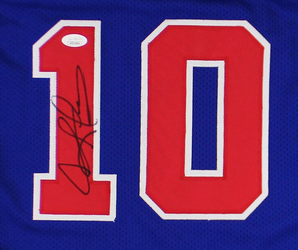 A Detroit Custom Blue Jersey hand signed by Dennis Rodman. The item and signature are in excellent condition. Dennis Rodman is a former pro basketball player. Dennis is a 5x NBA Champion, 2x NBA All-Star, and 2x NBA Defensive Player of the Year. AUTHENTICATION: The item is accompanied by a JSA Certificate of Authenticity - JSA Serial Numbered Hologram -
