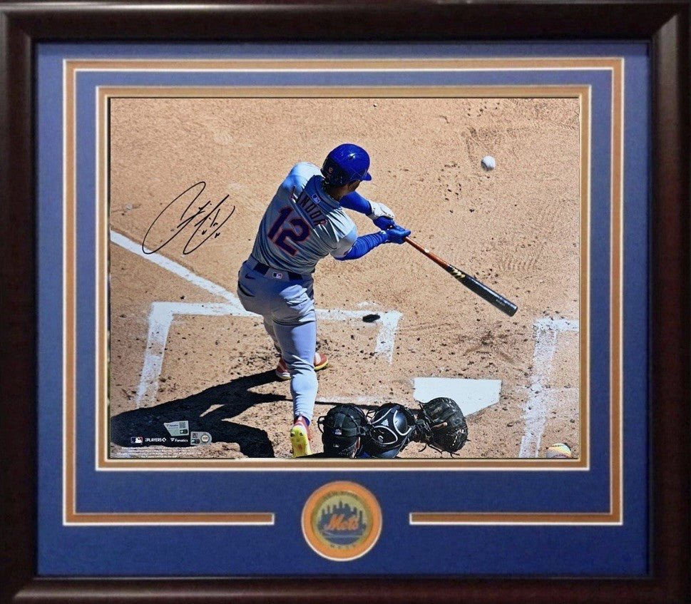 Francisco Lindor signed 16x20 framed photo. Hand signed in bold black by the Mets star. Framed in cherrywood with Mets colored matting and a Mets coin. Final framed dimensions are 25x27. Comes ready to hang.