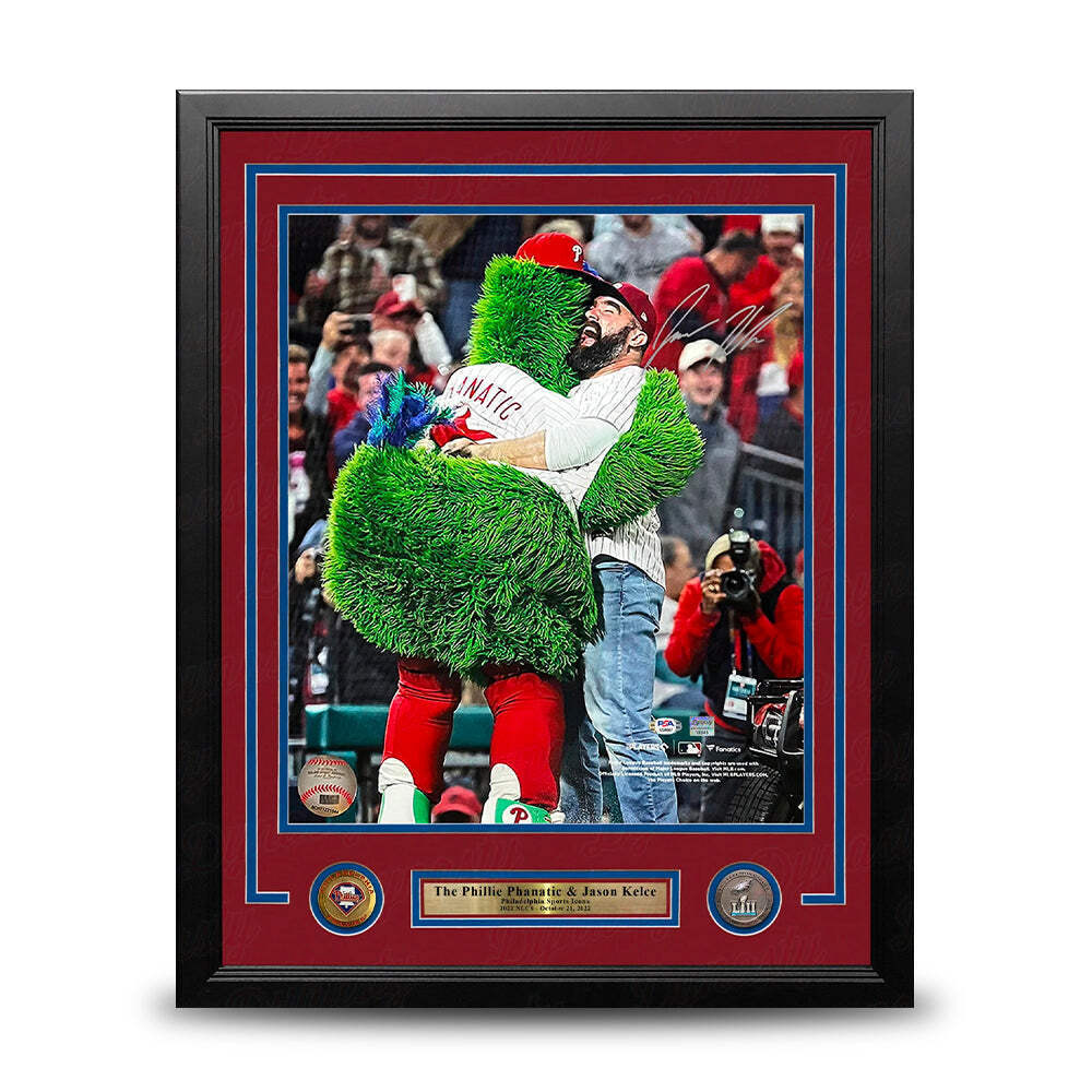 Jason Kelce Hugs Phillie Phanatic Autographed 16x20 Framed Baseball Photo PSA Officially licensed baseball photo autographed by Eagles legend Jason Kelce; authenticated by PSA This 2022 NLCS baseball photo has been hand-signed by Eagles Super Bowl Champion Jason Kelce. All autographed memorabilia includes a certificate of authenticity and matching hologram. Hand-Signed by Eagles legend Jason KelceSignatures are bold and clear on the photoAuthenticated by PSAFraming is professional qualityFramed 16" x 20" photo measures 22" x 26"