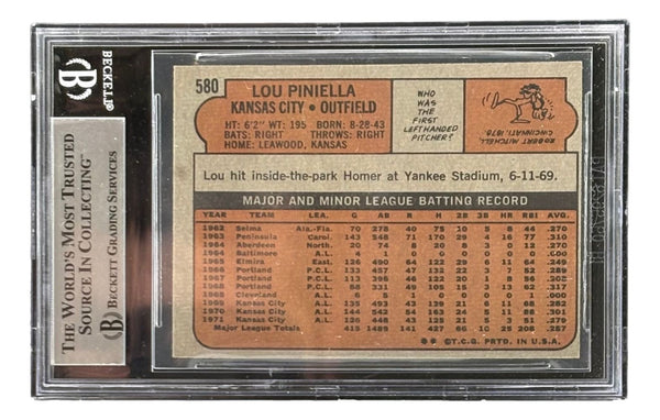 Featured is a Lou Piniella signed 1972 Topps #580 trading card. This card has been hand signed by Piniella and has been authenticated and encapsulated by Beckett. This card would make a great addition to any sports memorabilia collection. **Stock image used.** SPECIFICATIONS Autographed By: Lou Piniella Team: Kansas City Royals Sport: Baseball Authentication: Beckett Grading Services (BGS)
