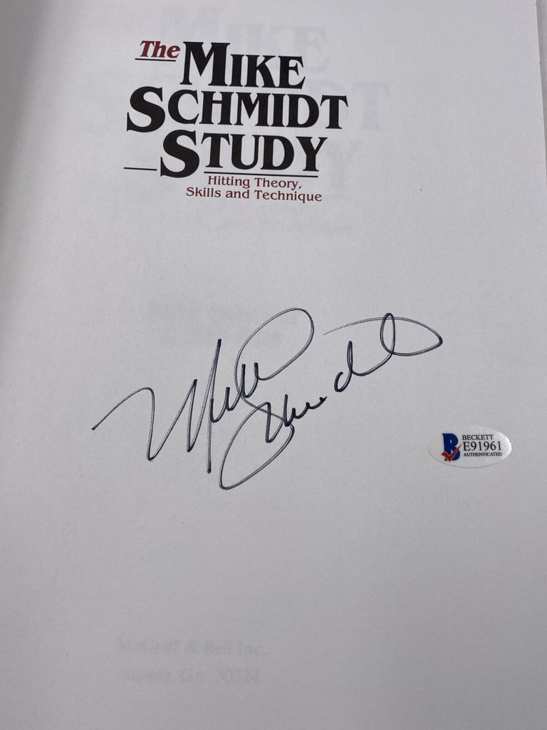 Featured is a Mike Schmidt signed copy of The Mike Schmidt Study. This book has been hand signed by Schmidt and comes with the Beckett hologram and certificate of authenticity. This book would make a great addition to any sports memorabilia collection!. SPECIFICATIONS Autographed By: Mike Schmidt Team: Philadelphia Phillies Sport: Baseball Authentication: Beckett Grading Services