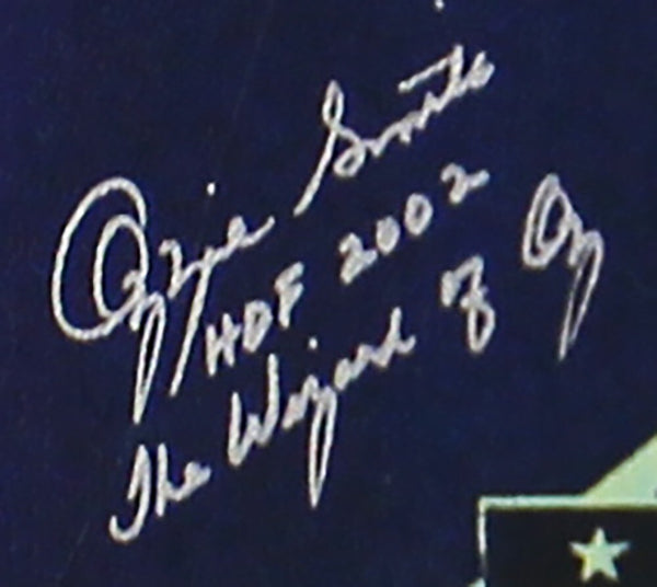 A St. Louis Cardinals 12x34 Mega Ticket MLB Canvas hand signed by Ozzie Smith. The item and signature are in excellent condition. In addition to signing his name, Ozzie inscribed "HOF 2022" and "Wizard of Oz" on the item. Ozzie Smith is a former American professional baseball shortstop who played in Major League Baseball for the San Diego Padres and the St. Louis Cardinals from 1978 to 1996. Nicknamed "The Wizard" for his exceptional defensive skills, Smith is widely considered one of the greatest defensive shortstops in baseball history. He won 13 consecutive Gold Glove Awards (1980-1992), made 15 All-Star appearances, and helped lead the Cardinals to a World Series title in 1982. He was inducted into the Baseball Hall of Fame in 2002. AUTHENTICATION: The item is accompanied by a JSA Certificate of Authenticity - JSA Serial Numbered and Databased Hologram