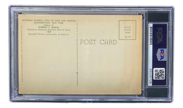 Featured is a Stan Musial (St. Louis Cardinals) signed 4x6 Hall Of Fame plaque card. This card has been hand signed by Musial and has been authenticated and encapsulated by PSA/DNA. This card would make a great addition to any sports memorabilia collection! SPECIFICATIONS Autographed By: Stan Musial Team: St. Louis Cardinals Sport: Baseball Authentication: Professional Sports Authenticator (PSA)