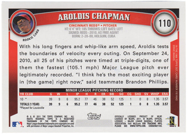Aroldis Chapman signed Cincinnati Reds 2011 Topps rookie baseball trading card #110. Item comes with a Schwartz Sports Memorabilia tamper-proof numbered hologram and Certificate of Authenticity which can be verified online.