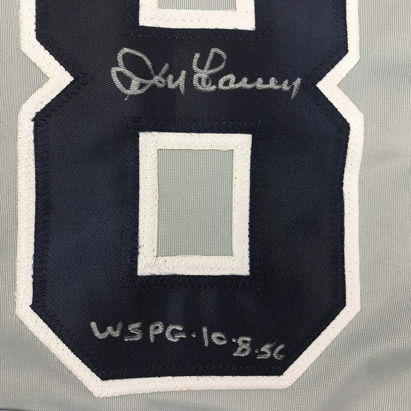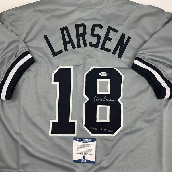 Autographed/Signed Don Larsen WS PG 10-8-56 New York Grey Jersey Beckett COA This is a custom jersey and was not manufactured by or in any manner associated with any professional sports league or manufacturer. This custom jersey carries no professional sports league designation. The item is intended to be an autographed collectible. Reference of team in the title is to allow the purchaser a point of association. The custom jersey displays the name, number and authenticated signature of the player. This item in no way is affiliated with or connected to any professional sports organization. The autograph, as always is guaranteed to be authentic and has been certified as authentic by a third-party, trusted authenticator. Size is XL unless otherwise noted.