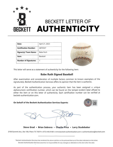 This Autographed w/ Original Box Spalding Babe Ruth Home Run Special Baseball has been Personally Signed by Babe Ruth of the New York Yankees. This item is 100% Authentic to include a Certificate of Authenticity (COA) / hologram by Beckett Authentication Services. The authenticity can be verified on Beckett Authentication Services website.
