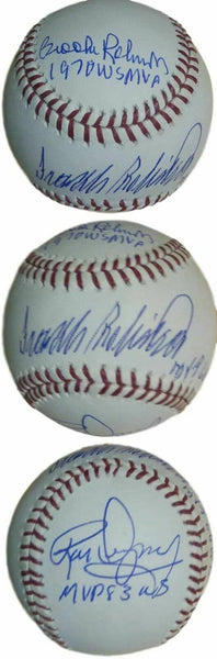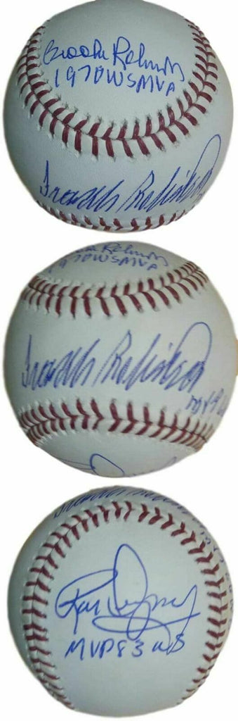 Baltimore Orioles MVPs Autographed OML Baseball Dempsey Frank & Brooks JSA 12658 This is an official Major Leaguebaseball that was personally signed by the three Baltimore Orioles World Series MVP's FrankRobinson, Brooks Robinson, and Rick Dempsey. Each player included an inscription with WS MVP and the year. This ball includes a certificate of authenticity from James Spence Authentication (JSA) and Denver Autographs.