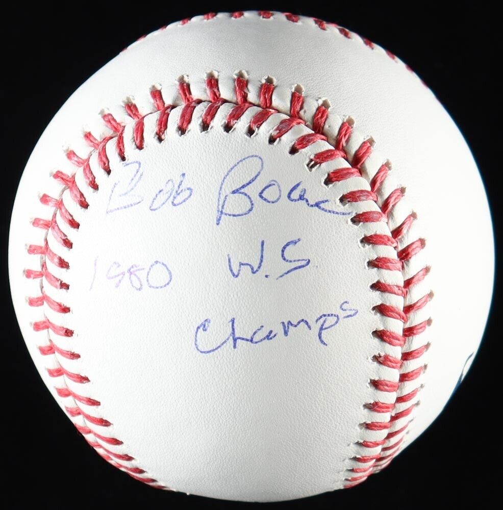 Rawlings Official Major League Baseball. Hand-signed and inscribed by Bob Boone (Philadelphia Phillies, California Angels, Kansas City Royals).The autograph(s) includes an official Schwartz Sports Hologram and matching COA for authenticity purposes.Authentication: Schwartz Sports COA