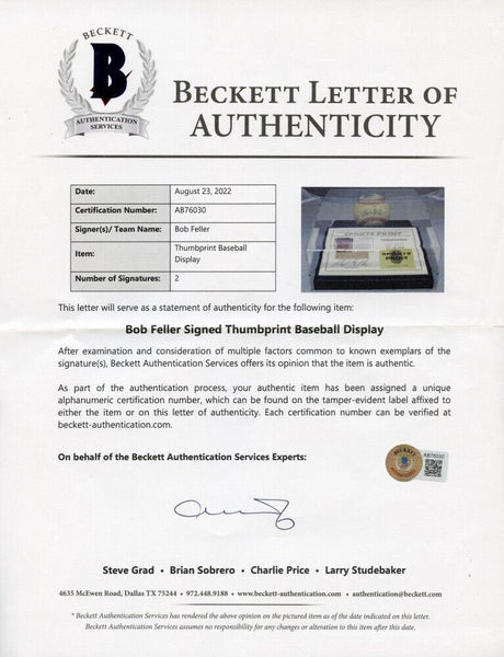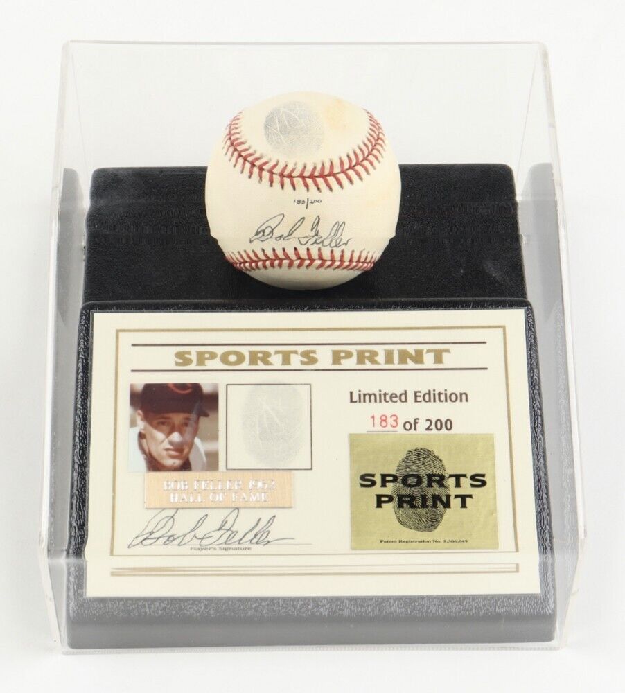 Rawlings Official American League baseball display. Hand-signed by Bob Feller (D. 2010, Cleveland Indians, HOF). Display case is included as shown. Please note, this item is limited to 200 pieces and the winning bidder will receive a random number from the same edition.This is a stock item and stock images may be used in this listing. The exact item you will receive will be of equal quality to the one pictured.The autograph includes an official Beckett Authentication Services hologram and matching LOA for authenticity purposes.Authentication: Beckett LOA