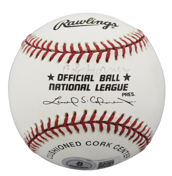 This Autographed Leonard S. Coleman Baseball has been Personally Signed by Bob Horner of the Milwaukee Braves. This item is 100% Authentic to include a hologram by Beckett Authentication Services. This item will come with an affixed Beckett Authentication Services (BAS) authentication sticker, which includes a scannable QR code to verify authenticity. Please note that Beckett no longer provides serial-numbered COA cards, and the attached BAS sticker will serve as the complete authentication for this item. The authenticity can be verified on Beckett Authentication Services website.