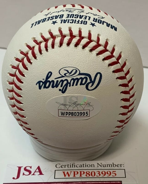 An official Major League Brewers 50th Anniversary Baseball hand signed by MILWAUKEE/ATLANTA BRAVES HALL OF FAMER HANK AARON. The signature is in blue ink pen. This baseball was signed at a private signing with us. This would make a great addition to any BREWERS, BRAVES or AARON collection! This item is guaranteed to be 100% authentic and will include a COA from JSA (James Spence Authentication).
