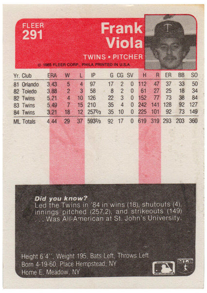 Frank Viola signed Minnesota Twins 1985 Fleer baseball trading card #291. Item comes with a Schwartz Sports Memorabilia tamper-proof numbered hologram (on back of physical card) and Certificate of Authenticity which can be verified online.
