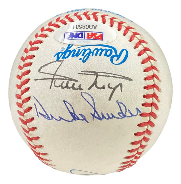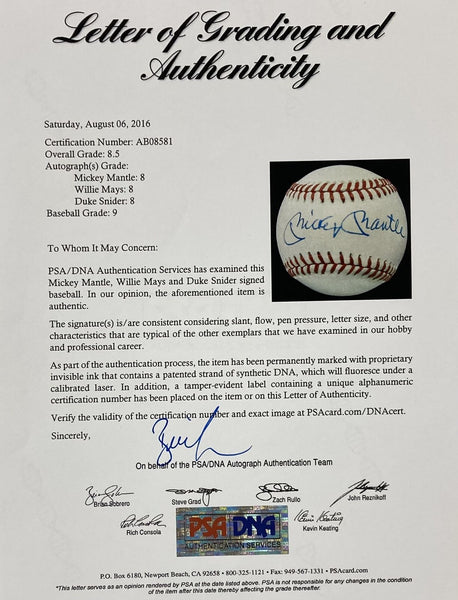 Featured is a Mickey Mantle, Willie Mays and Duke Snider signed official American League baseball. This ball has been hand signed by Mantle, Mays and Snider and comes with the PSA hologram and letter of authenticity. This baseball has received a condition grade of 9, overall grade of 8.5, and each autograph was graded 8. This baseball would make a great addition to any sports memorabilia collection! SPECIFICATIONS Autographed By: Team: Sport: Baseball Authentication: Professional Sports Authenticator (PSA)