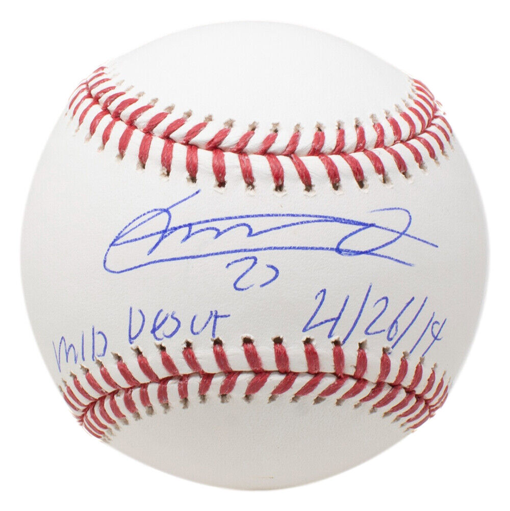 Featured is a Vladimir Guerrero Jr. signed Toronto Blue Jays MLB baseball in which he added the "MLB Debut 4/26/19" inscription. This baseball was hand signed by Vladimir Guerrero Jr. and authenticated by JSA authentication services. Included with the baseball is a JSA hologram and certificate of authentication. This item would make a great addition to any sports memorabilia collection! SPECIFICATIONS Autographed By: Vladimir Guerrero Jr. Team: Toronto Blue Jays Sport: Baseball Authentication: Professional Sports Authenticator (PSA)