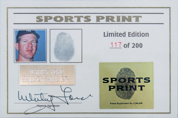 This Autographed Limited Edition Numbered To 200 w/ Display Case Thumbprint Oal Baseball has been Personally Signed by Whitey Ford of the New York Yankees. This item is 100% Authentic to include a Certificate of Authenticity (COA) / hologram by Beckett Authentication Services. We have multiples of this same item. While the photographs are representative of this item, the size, placement and strength of the signature may vary. Each item is hand signed, therefore, each autograph is unique. Each ball has a thumbprint of Whitey Ford , the photo in the case is also signed and has Whitey Ford signature, though the Beckett COA does not cover both signatures. These vintage balls all have some varying degrees of spotting and toning. We are not able to guarantee the coloring of the ball, and the number of the edition you may receive.