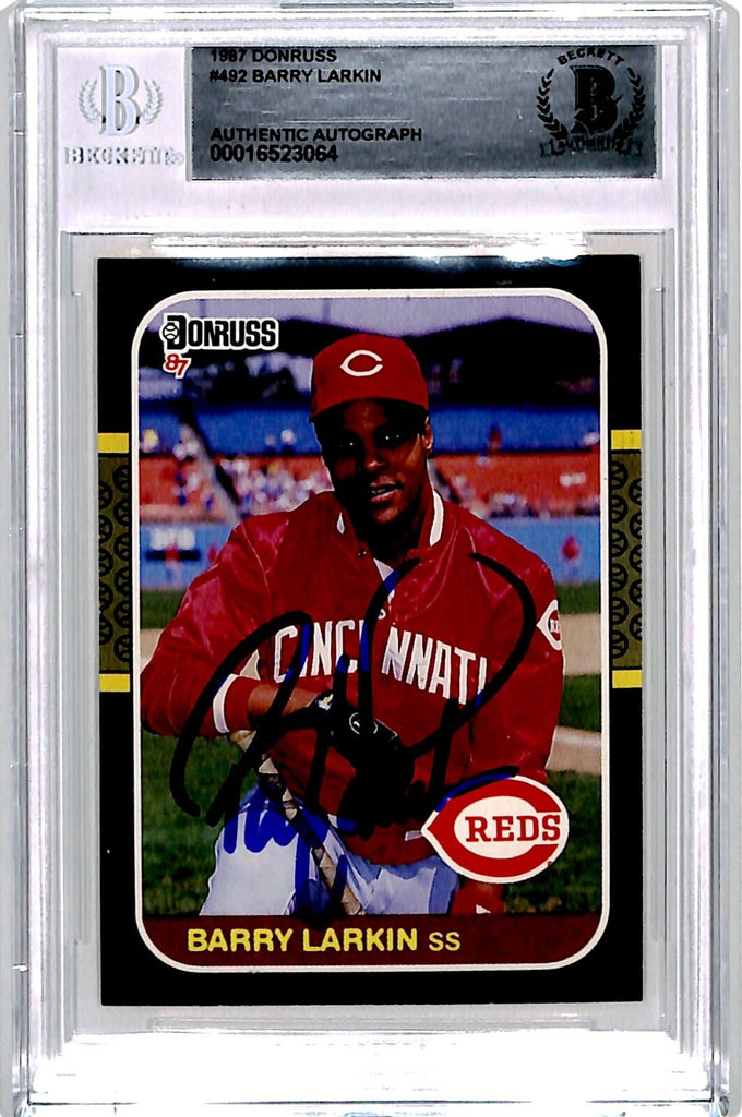 The number in the listing title is just an inventory sku for our records and is not the authentication number. The item pictured is a stock photo unless otherwise noted. This is a Detroit Pistons 1987 Donruss #492 slabbed trading card that was personally autographed by Barry Larkin. Includes a certificate of authenticity from Beckett Authentication Services (BAS) and Denver Autographs.FREE SHIPPING within the USA on orders over $10!