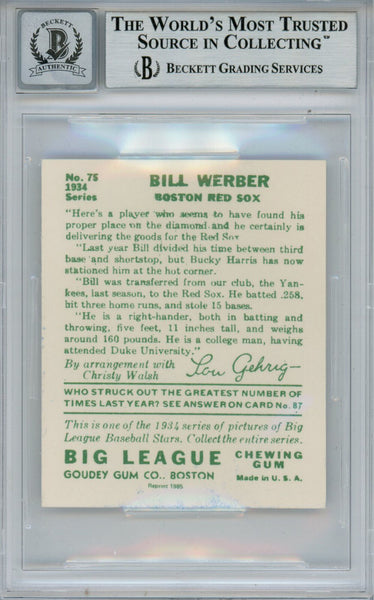 Bill Werber Signed 1934 Goudey '85 Reprints #75 Card Beckett 10 Slab 38468 The number in the listing title is just an inventory sku for our records and is not the authentication number. This is the exact item that you will receive so please see pictures for condition. This is a trading card that was personally autographed by Bill Werber. This has been professionally slabbed by Beckett Authentication Services (BAS) and includes a certificate of authenticity from Denver Autographs.