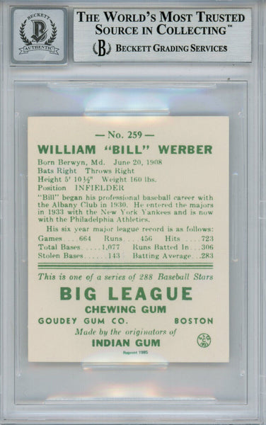 Bill Werber Signed 1938 Goudey Heads-Up '85 Reprints #259 Card BAS 10 Slab 38461