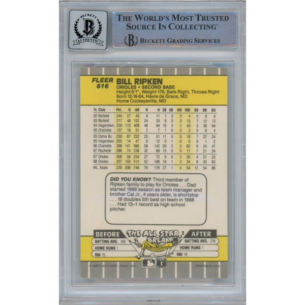 The number in the listing title is just an inventory sku for our records and is not the authentication number. The item pictured is the exact item you will receive, please see photos for condition. This is a Baltimore Orioles 1989 Fleer #616 Slabbed Trading Card with a Grade 10 Autograph that was personally autographed by Billy Ripken. Includes a certificate of authenticity from Beckett Authentication Services (BAS) and Denver Autographs.
