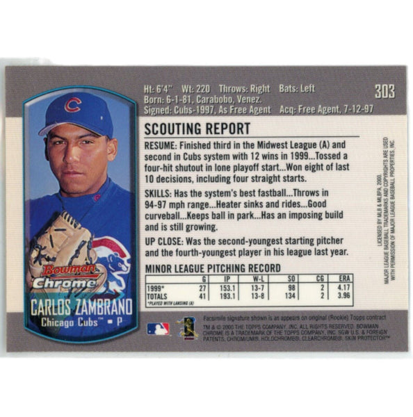 The number in the listing title is just an inventory sku for our records and is not the authentication number. The item pictured is the exact item you will receive, please see photos for condition. This is a Chicago Cubs 2000 Bowman Chrome 303 Trading Card that was personally autographed by Carlos Zambrano. Includes a certificate of authenticity from (DEN) Denver Autographs.FREE SHIPPING within the USA on orders over $10!