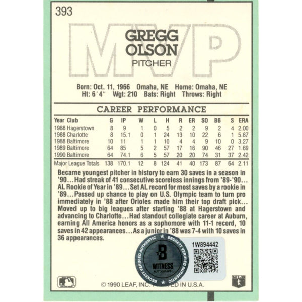 The number in the listing title is just an inventory sku for our records and is not the authentication number. The item pictured is a stock photo unless otherwise noted. This is a Baltimore Orioles 1990 MVP #393 Slabbed Trading Card that was personally autographed by Gregg Olson. Includes a certificate of authenticity from Beckett Authentication Services (BAS) and Denver Autographs.FREE SHIPPING within the USA on orders over $10!