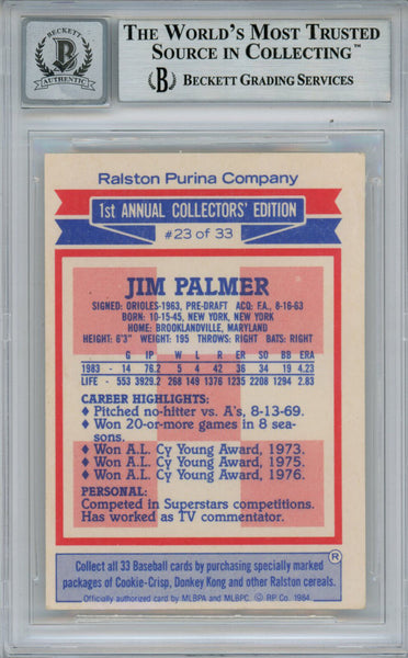 Jim Palmer Signed Topps/Ralston Purina #23 Trading Card Beckett 10 Slab 38478 The number in the listing title is just an inventory sku for our records and is not the authentication number. This is the exact item that you will receive so please see pictures for condition. This is a trading card that was personally autographed by Jim Palmer. This has been professionally slabbed by Beckett Authentication Services (BAS) and includes a certificate of authenticity from Denver Autographs.