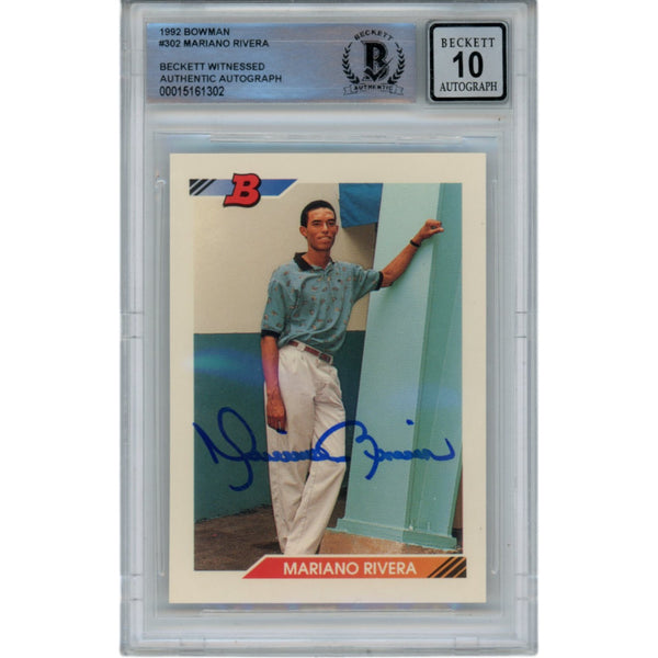The number in the listing title is just an inventory sku for our records and is not the authentication number. The item pictured is the exact item you will receive, please see photos for condition. This is a New York Yankees Bowman #302 Slabbed Trading Card with a Grade 10 Autograph that was personally autographed by Mariano Rivera. Includes a certificate of authenticity from Beckett Authentication Services (BAS) and Denver Autographs.FREE SHIPPING within the USA on orders over $10!