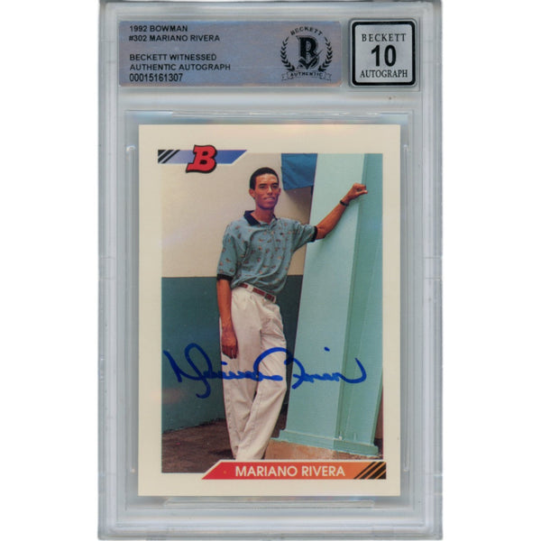 The number in the listing title is just an inventory sku for our records and is not the authentication number. The item pictured is the exact item you will receive, please see photos for condition. This is a New York Yankees Bowman #302 Slabbed Trading Card with a Grade 10 Autograph that was personally autographed by Mariano Rivera. Includes a certificate of authenticity from Beckett Authentication Services (BAS) and Denver Autographs.FREE SHIPPING within the USA on orders over $10!
