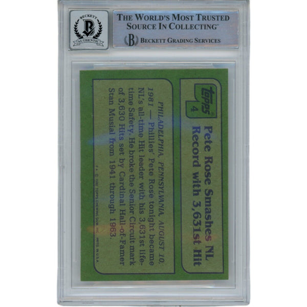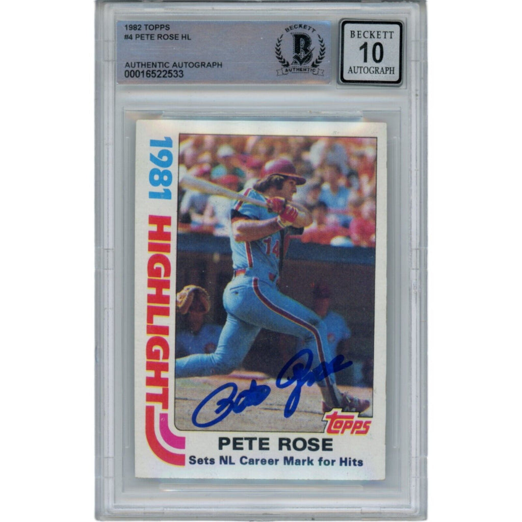 The number in the listing title is just an inventory sku for our records and is not the authentication number. The item pictured is a stock photo unless otherwise noted. This is a Philadelphia Phillies 1982 Topps #4 Slabbed Trading Card that was personally autographed by Pete Rose. Includes a certificate of authenticity from Beckett Authentication Services (BAS) and Denver Autographs.