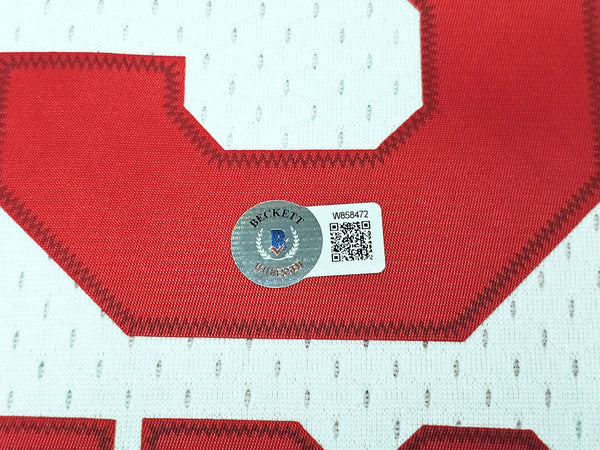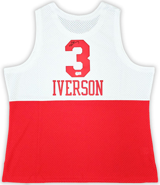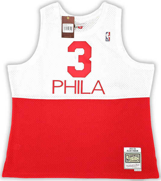 This is a White & Red Authentic Mitchell & Ness Philadelphia 76ers 2003-04 HWC Swingman Jersey that has been hand signed by Allen Iverson. This jersey is Size XXL. This item has been witnessed and certified authentic by Beckett Authentication (BAS) and comes with their tamper-proof witness sticker.