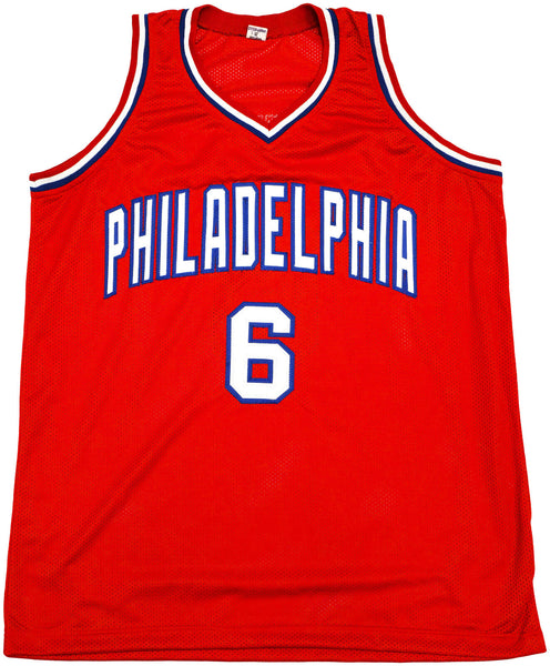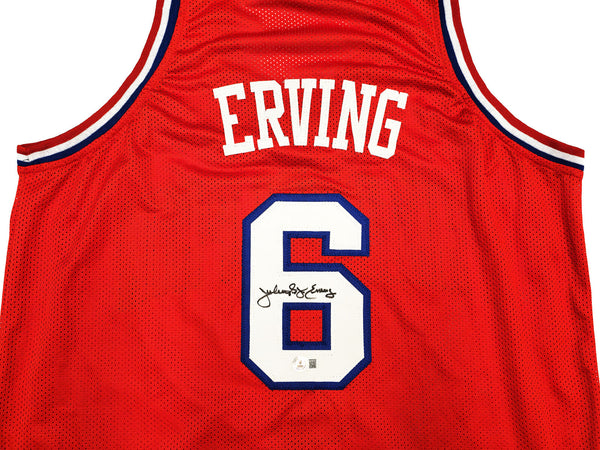 This is a Red Jersey that has been hand signed by Julius "Dr. J" Erving This is a custom jersey with no name brand. The approximate size is XL. It has nice sewn in name and numbers. This item has been witnessed and certified authentic by Beckett Authentication (BAS) and comes with their tamper-proof witness sticker.