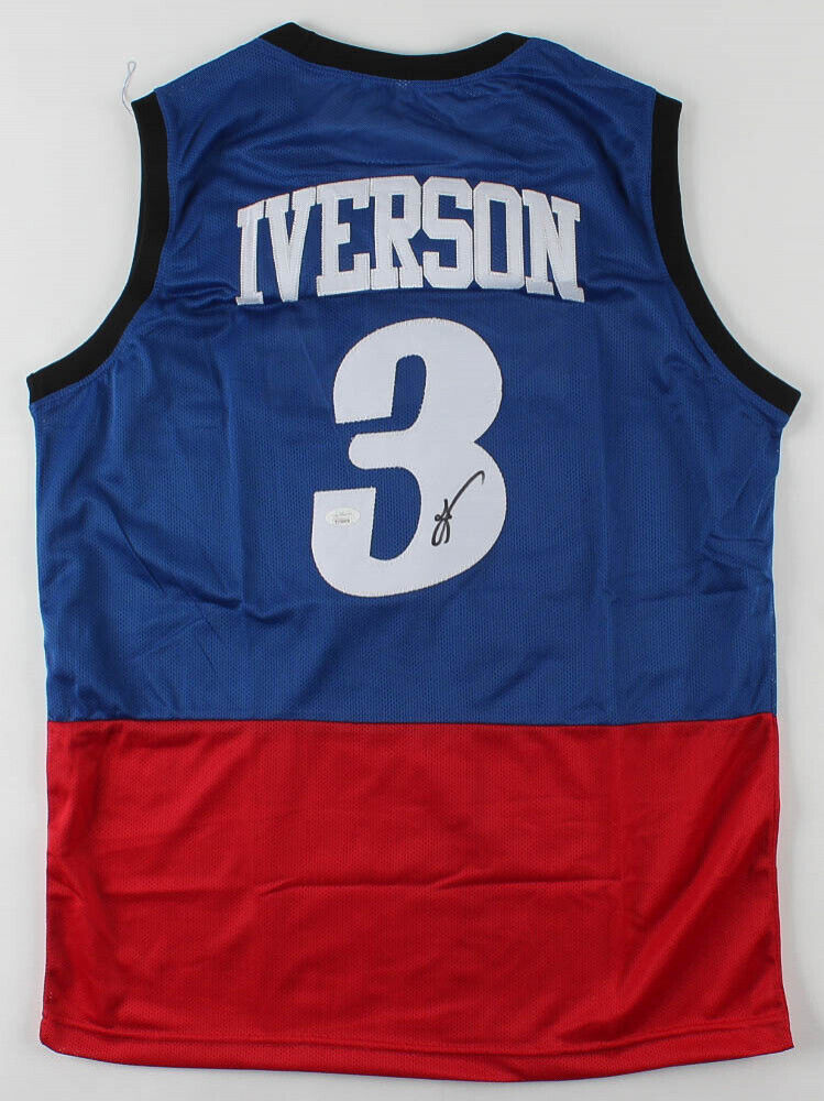 Custom on-court style jersey. Everything sewn on, size XL. Hand-signed in black paint pen by Allen Iverson (HOF). The lot / autograph(s) includes an official James Spence Authentication (JSA) Hologram and matching COA for authenticity purposes.Authentication: JSA COA