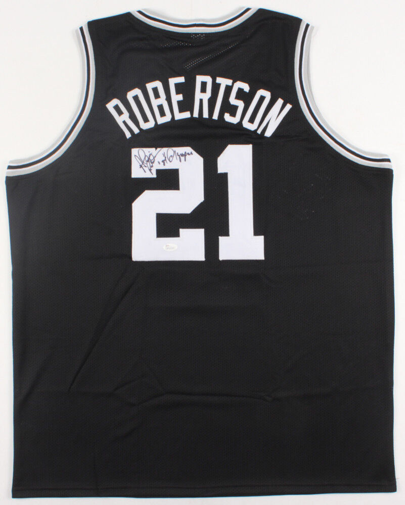 Custom on-court style jersey. Everything is sewn on, size XL. Hand-signed and inscribed in black felt-tip pen by Alvin Robertson (Spurs). The lot / autograph(s) includes an official James Spence Authentication (JSA) hologram and matching COA for authenticity purposes. The signing of this item was witnessed by JSA.Authentication: JSA COA