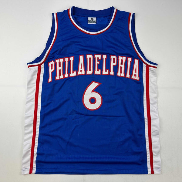 Autographed/Signed Julius Erving Dr. J Philadelphia Blue Jersey JSA COA Jersey has no brand names or logos. This is a custom jersey and was not manufactured by or in any manner associated with any professional sports league or manufacturer. This custom jersey carries no professional sports league designation. The item is intended to be an autographed collectible. The custom jersey displays the name and number of the player. This item in no way is affiliated with or connected to any professional sports organization. Size is XL.