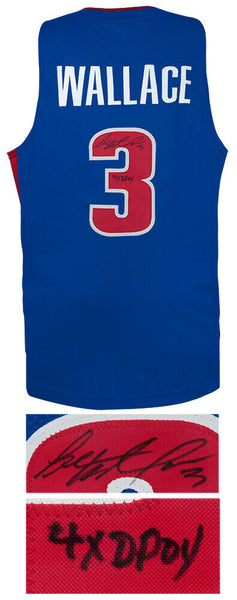 Ben Wallace signed blue custom basketball jersey with '4x DPOY' inscription. Item comes with a Schwartz Sports Memorabilia tamper-proof numbered hologram and Certificate of Authenticity which can be verified online. Jersey is size XL.