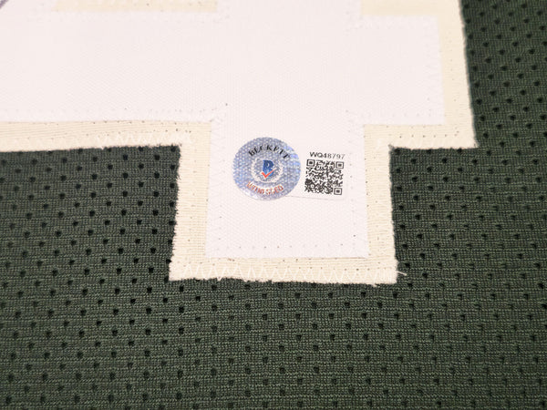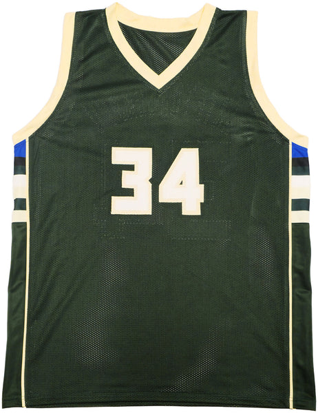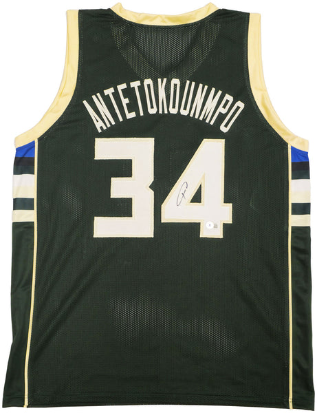 This is a Green Jersey that has been hand signed by Giannis Antetokounmpo. This is a custom jersey with no name brand. The approximate size is XL. It has nice sewn in name and numbers. This item has been witnessed and certified authentic by Beckett Authentication (BAS) and comes with their tamper-proof witness sticker.