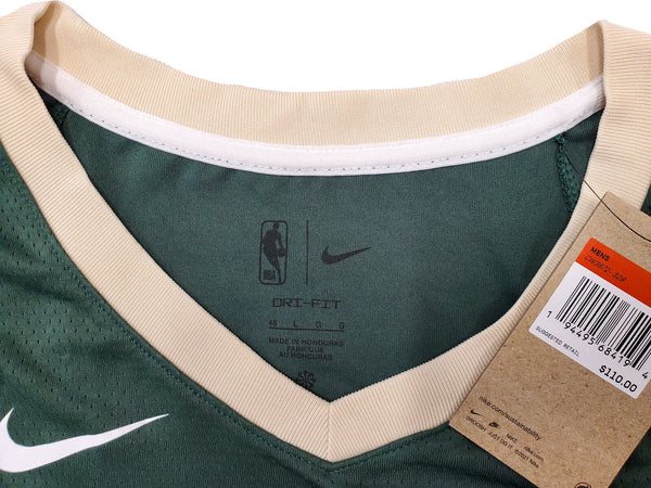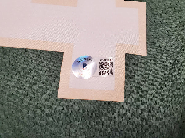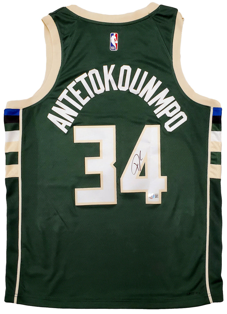 This is a Green Nike Milwaukee Bucks Jersey that has been hand signed by Giannis Antetokounmpo. This jersey is Size L. This item has been certified authentic by Beckett Authentication (BAS) and comes with their tamper-proof QR Code sticker that can be verified on the Beckett-authentication.com.
