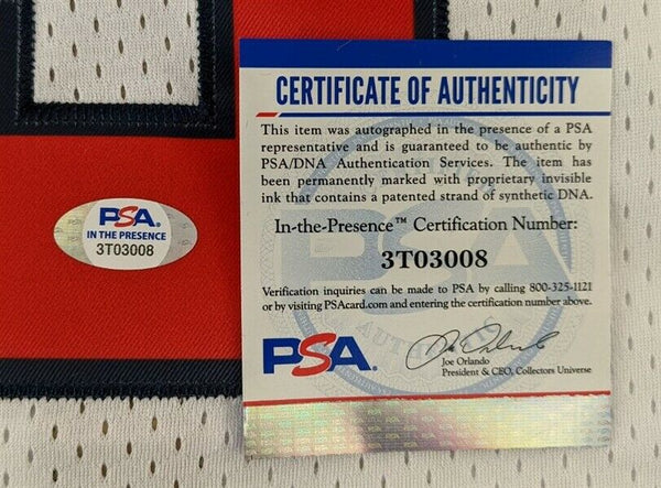 This autographed custom on-court style adult XL jersey has been personally hand-signed by Dream Team member, Chris Mullin.This autograph is certified by PSA/DNA's (Professional Sports Authenticators) In The Presence authentication. That means that a PSA representative was present when this item was signed. It comes with the PSA numbered hologram and QR Code card which verifies the signature on-line in PSA's Database.Custom on-field style jerseys are a more affordable option for autograph seekers. These jerseys do not have any brand name or tags and are made in the Philippines. They feature stitched on names and numbers and are made to look very similar to the on-field jerseys that the players wear. These custom jerseys are very commonly used in the memorabilia industry.