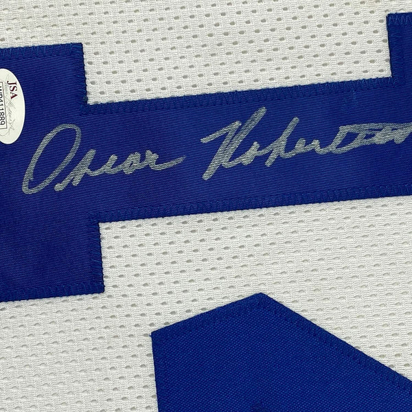 Framed Autographed/Signed Oscar Robertson 33x42 Cincinnati White Jersey JSA COA The item is professionally framed & matted with two 8x10 photos, measures 33"x42" and is ready to be hung in your man cave! NOTE: COA card will be mounted on the back of the frame, not inside it on top of the jersey as seen in the picture.